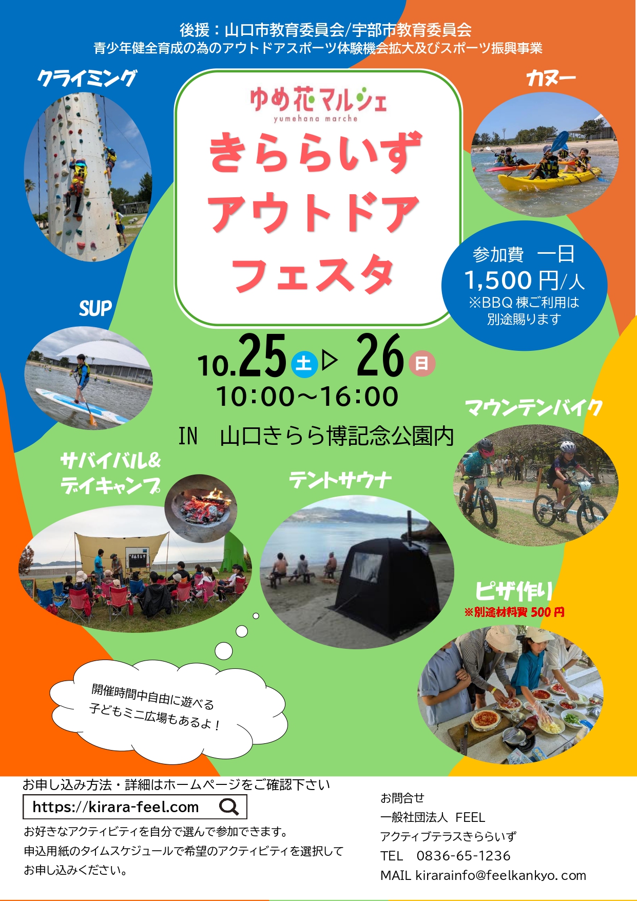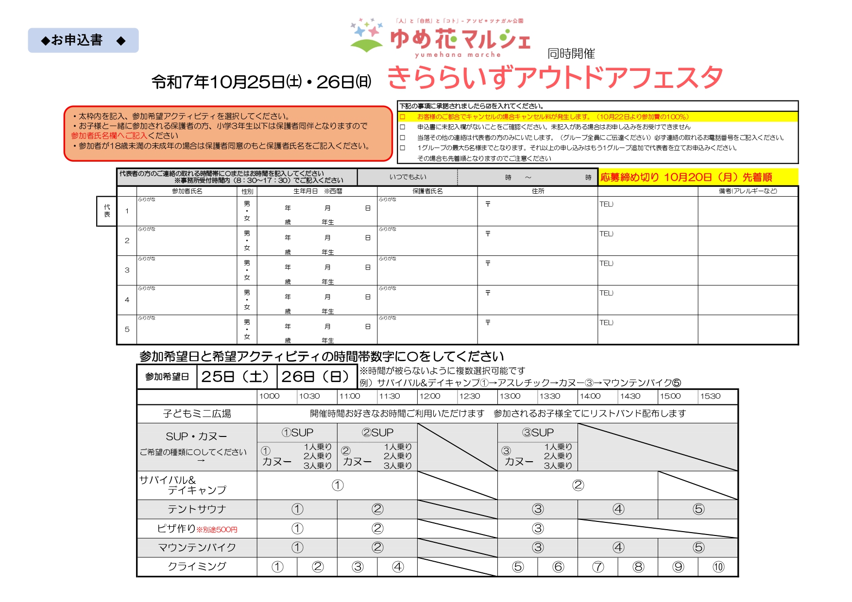 お知らせ きららいずアウトドアフェスタ ゆめ花マルシェアクティブテラスきららいず アウトドアフェスタいろんなアクテビィティを体験してみませんか?10月25日(土)・26日(日) 両日とも10:00~16:00チラシ.pdf開催要項.pdf申込書R7,10,25,26 TOPICS一覧へ 電話・問い合わせをする